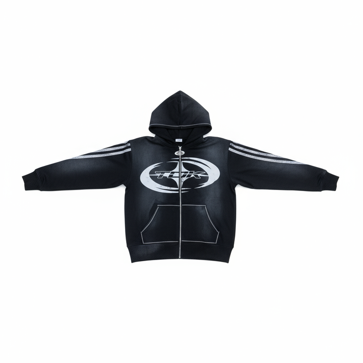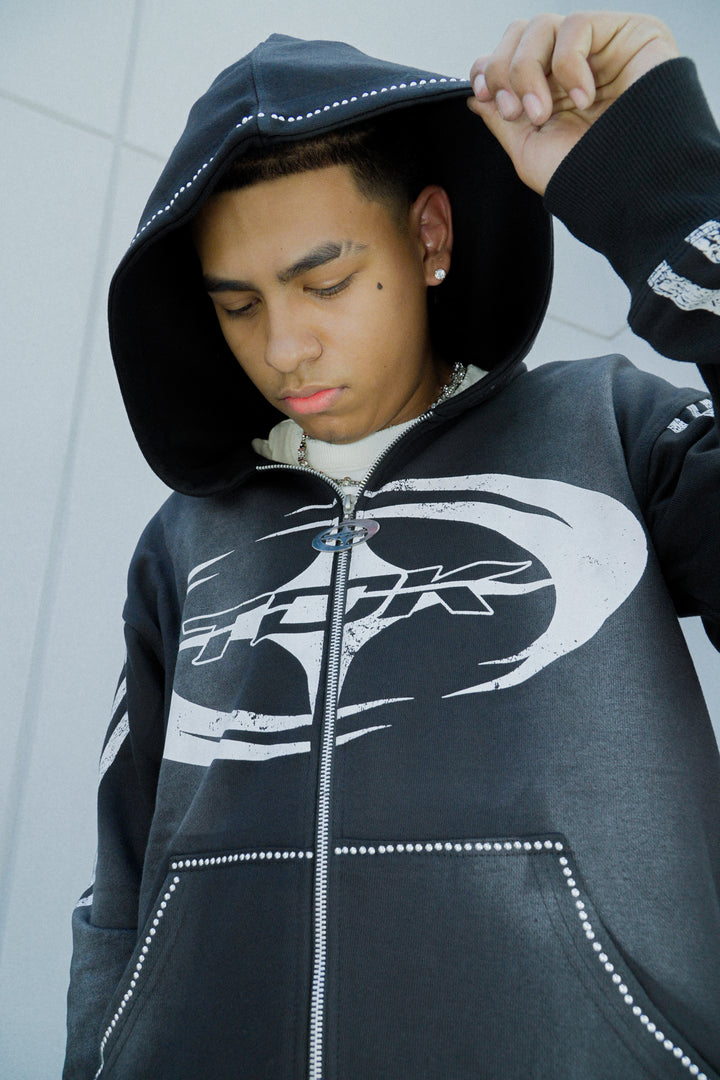 Turn heads with the TDK KRTV Studios Black Studded Zip-Up — where bold meets luxury.